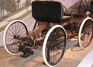 Upon walking into the exhibit, this reviewer's first impressions were striking. The light from several neon signs coupled with colors reflected from the automobiles immediately takes one into a Disney-like world. One section of the exhibit is chronological, and begins with walking shoes, horses, and stage coaches. But then the panels quickly move into turn of the century pioneer automobiles, including as one might predict, Henry Ford's Quadricycle. From that point onwards this section takes us predictably from one decade or era to another, finally ending with plug-in electric cars. Adjacent to this is a section on auto racing, which is a favorite among auto hobbyists and the young. The cars and colors are luscious, and the backdrops are artistically and thematically well done.